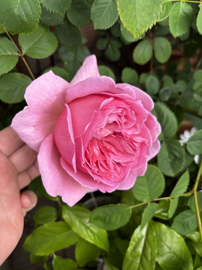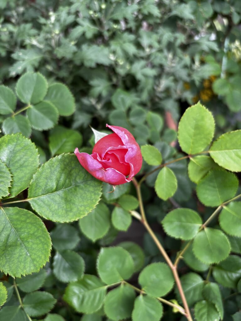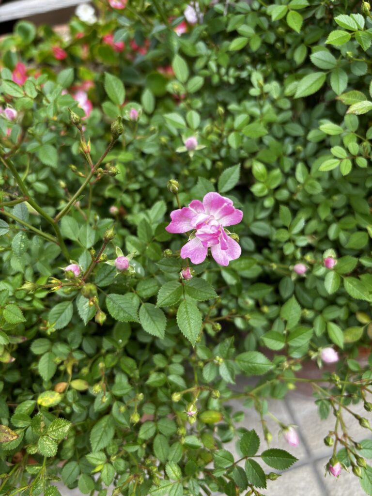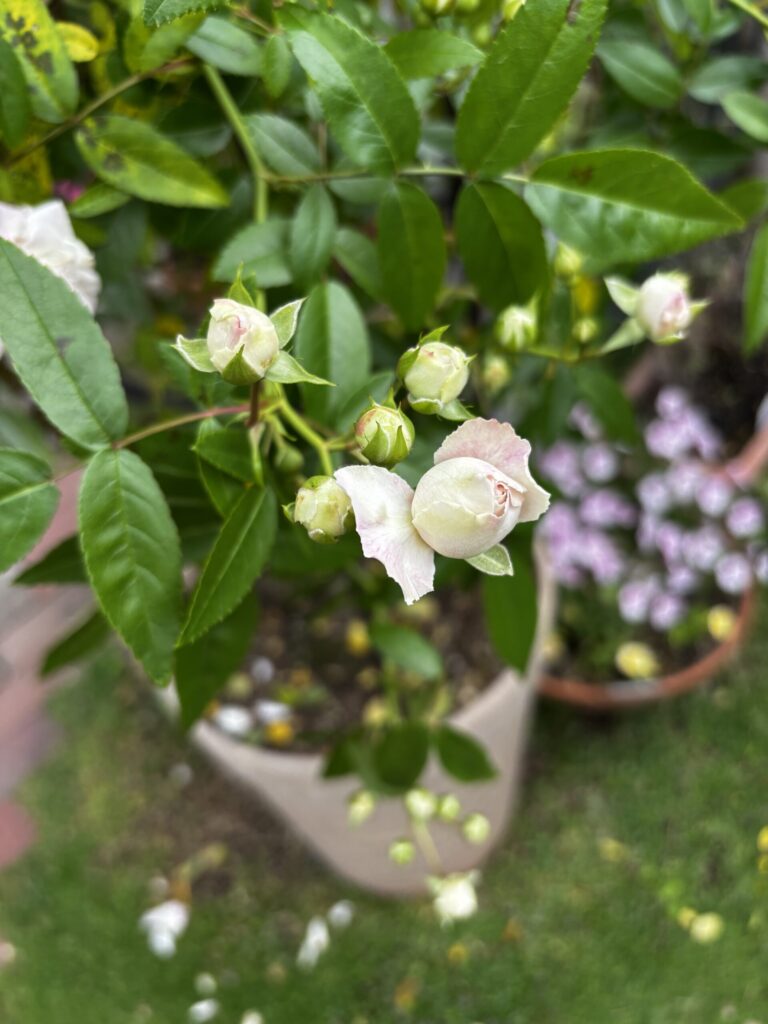 昨年は夏の猛暑の影響で株を弱らせてしまい、残念ながら一部のバラは枯れてしまいましたが、その中でも残っていた挿し木株がしっかりと成長し、今年ついに開花に至っています。